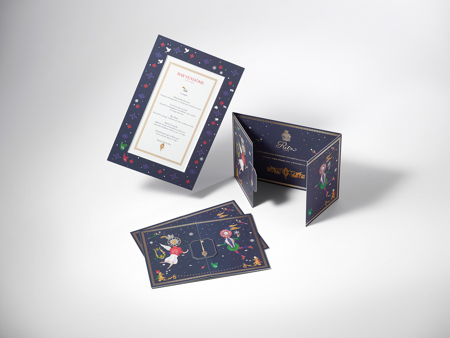 Creation of Christmas Eve and New Year's Eve greeting cards and menus illustrated by Jonathan Burton for Ritz Paris.