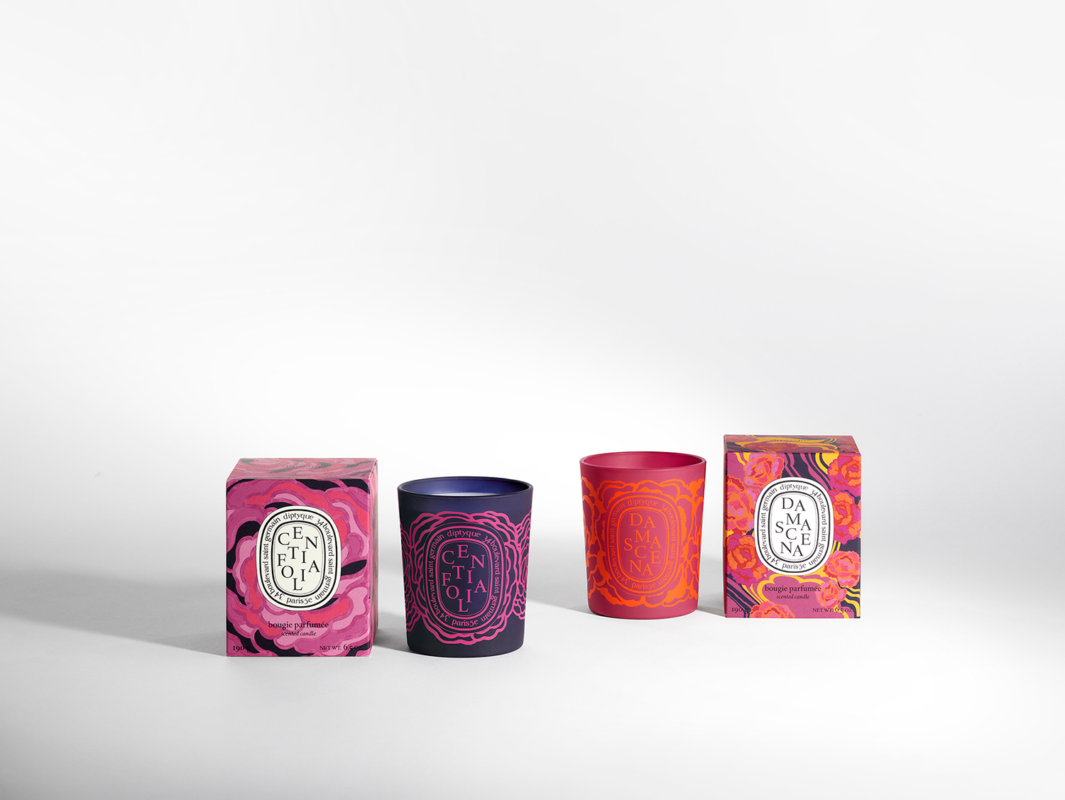 Graphic design for candles and cases illustrated by Jeanne Detallante for Diptyque.