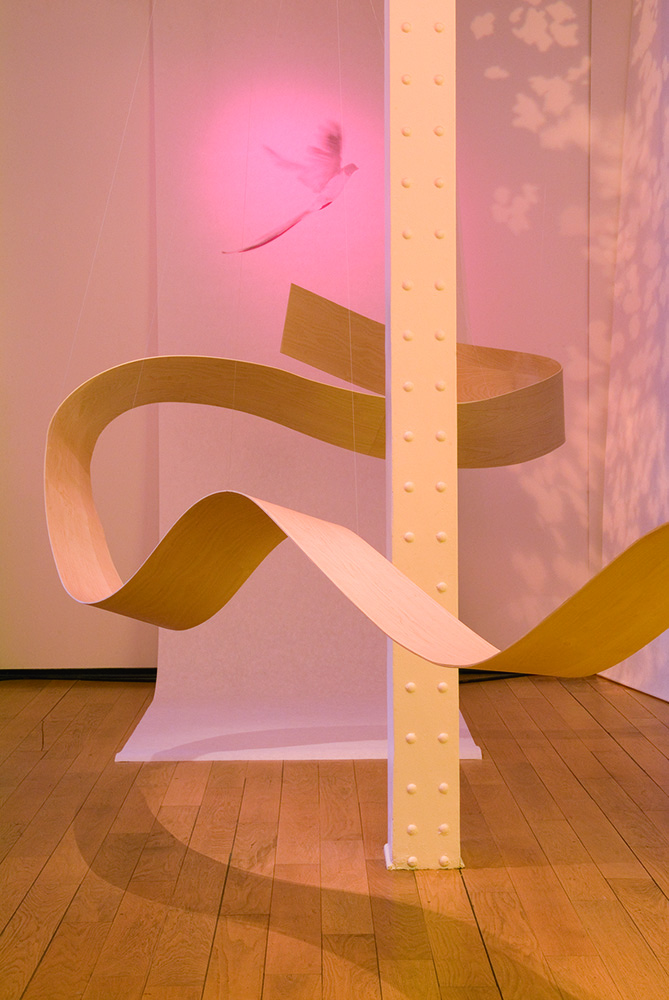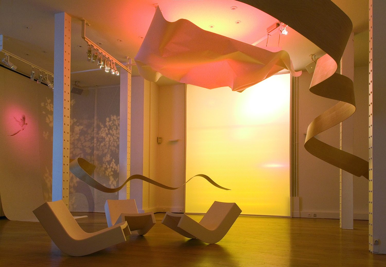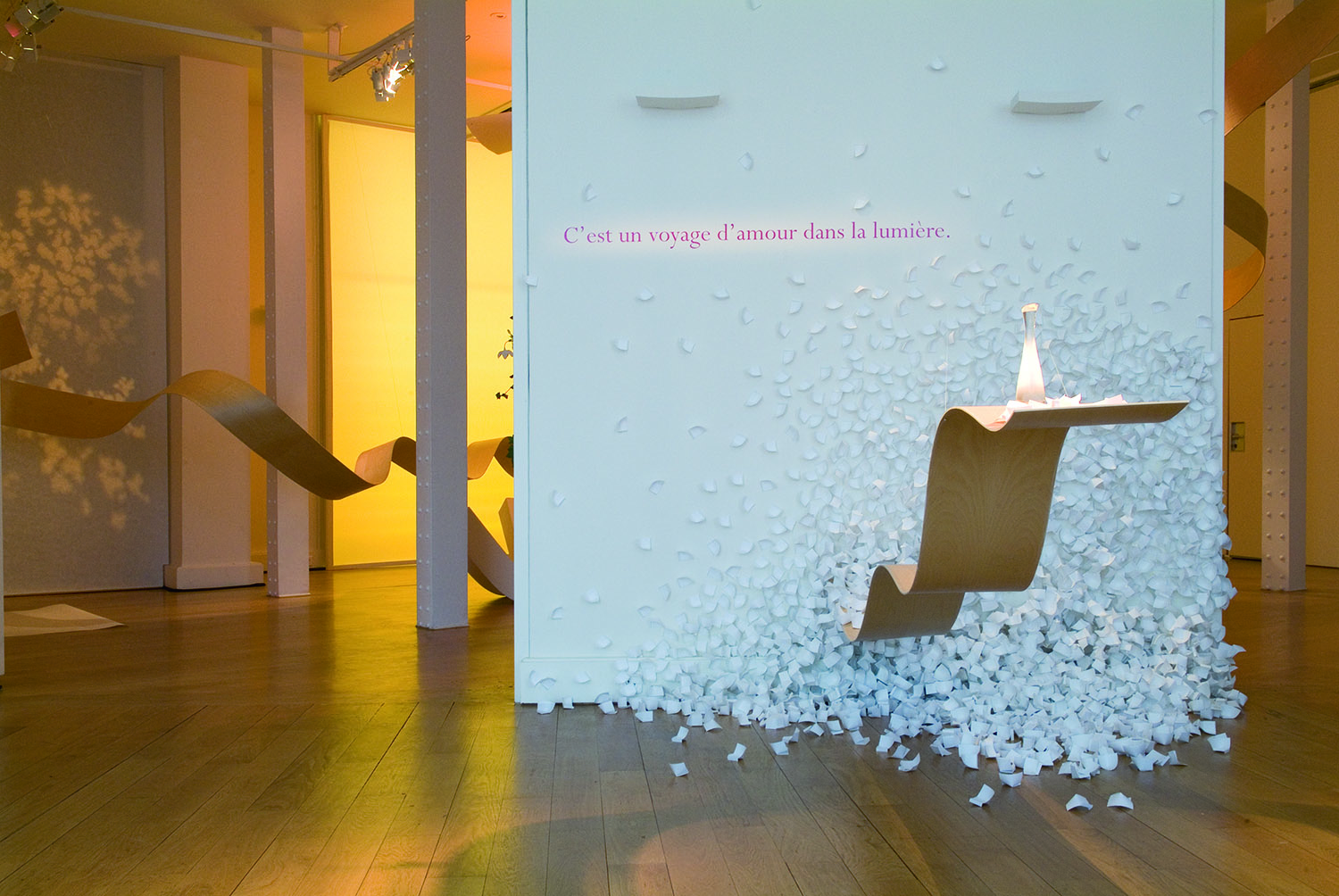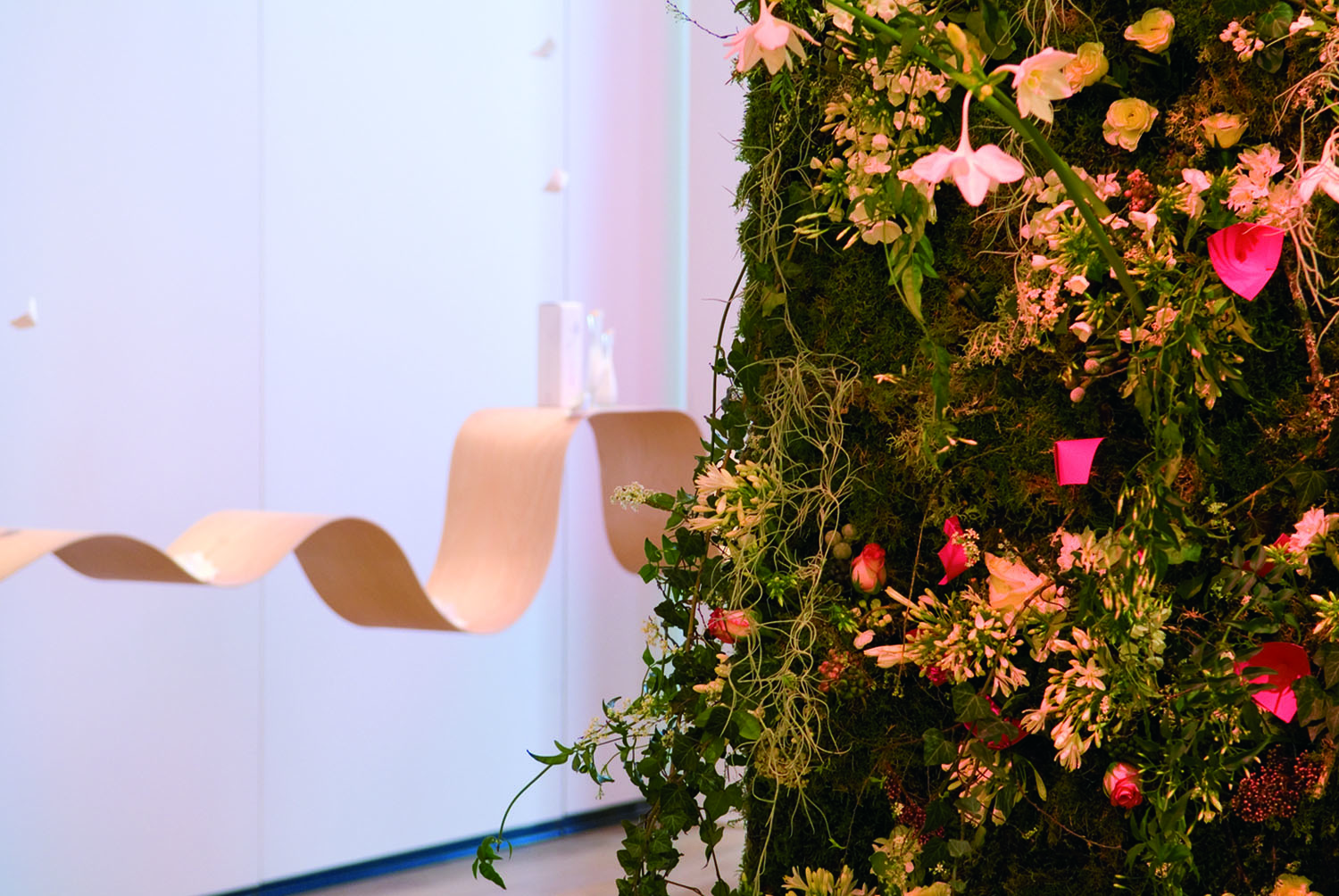 Inspired by the skyline featured in the advertising campaign for KENZO AMOUR Floral Eau de Toilette, a long ribbon of wood undulates through the space. The venue is bathed in the orange light of a late summer's day. Our minimalist scenography was designed as an invitation to travel. A wall covered with flowers used in the fragrance's composition awakened the senses.