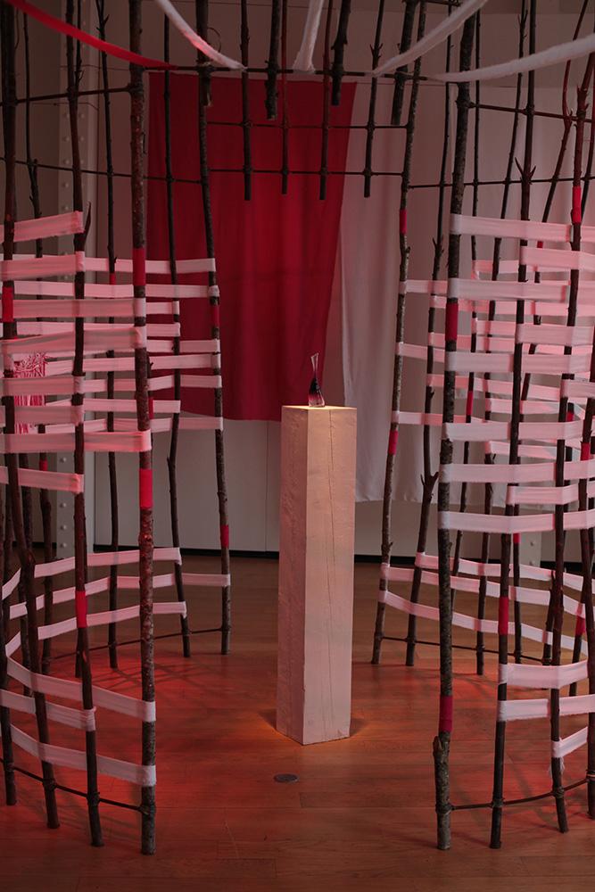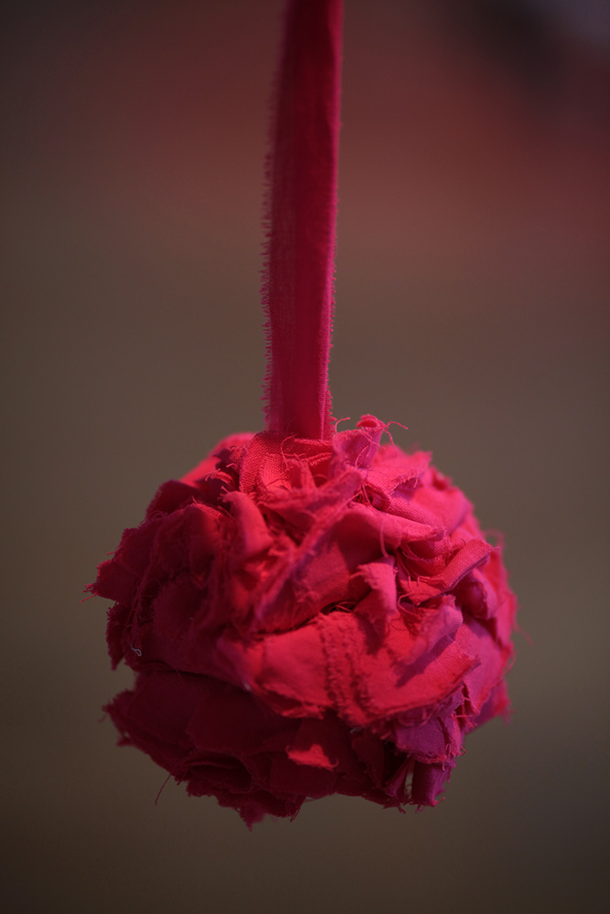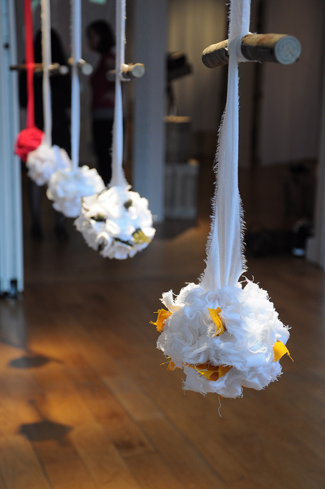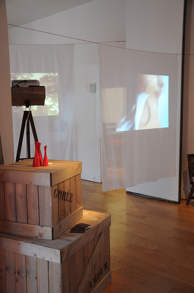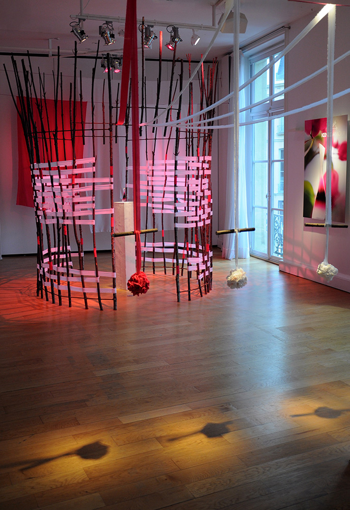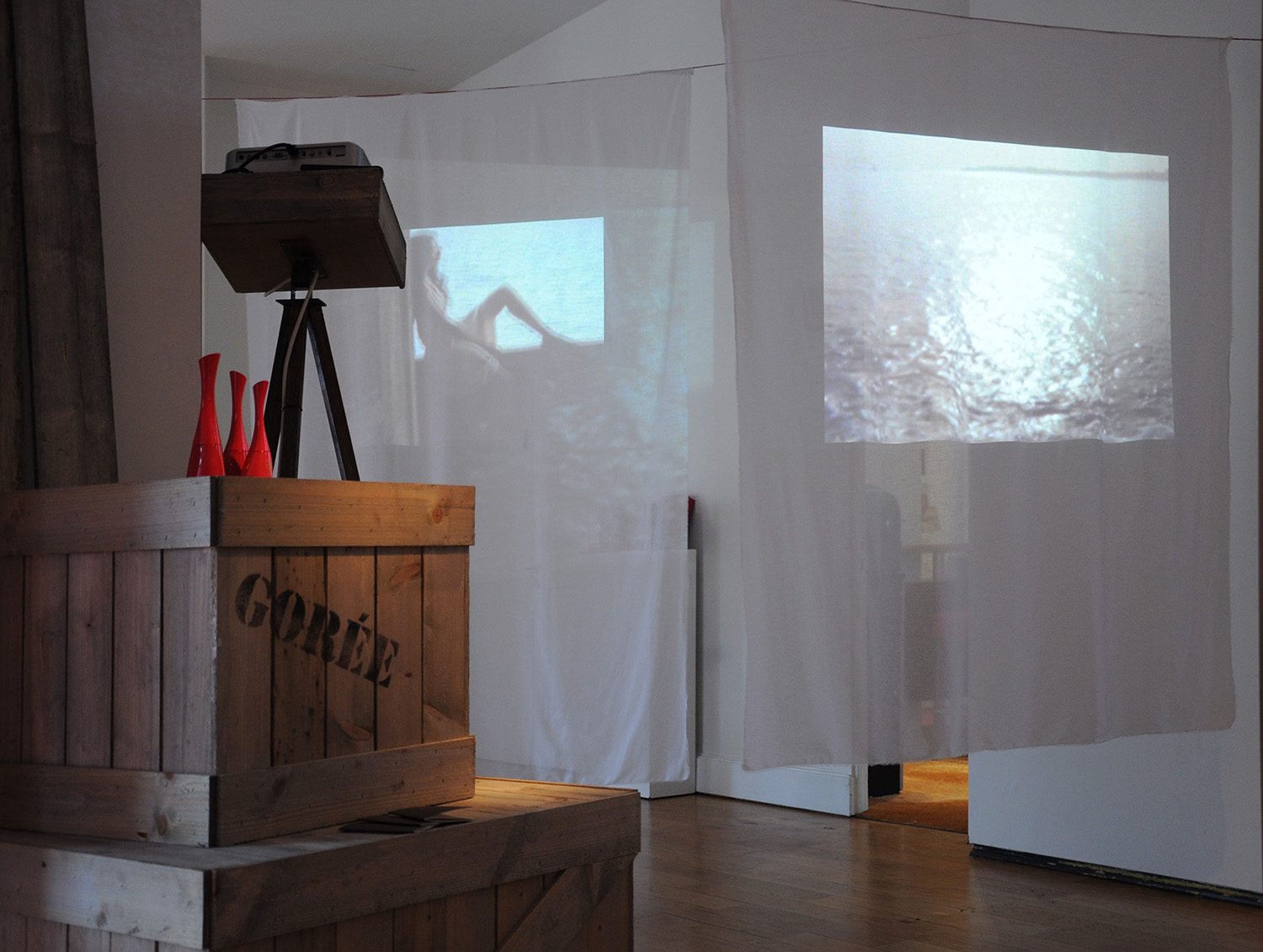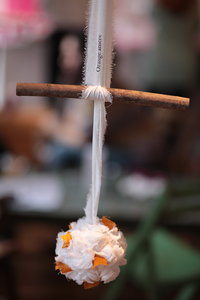 To recount this journey of love on the small island of Gorée, off the coast of Senegal, we wanted to showcase the simple, gentle life that unfolds there. The sheets drying on the clotheslines are projection screens, the gazebo made of branches connected by woven cotton strips magnifies the bottle, and scented pompons break down the olfactory pyramid.
