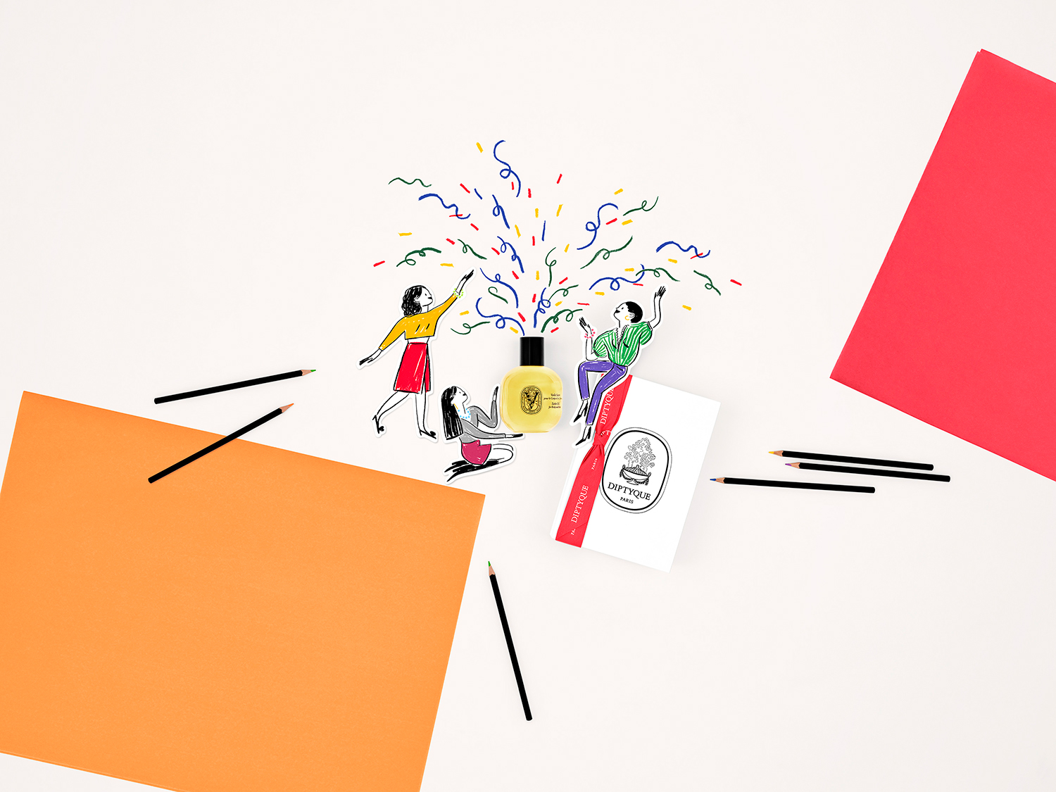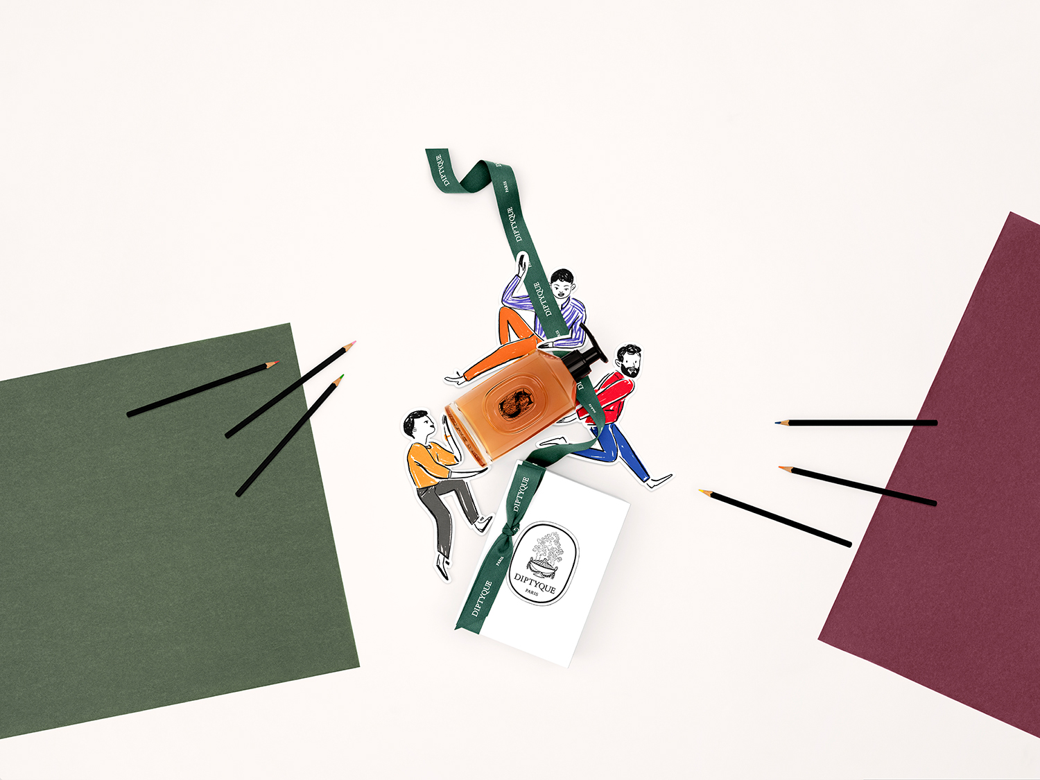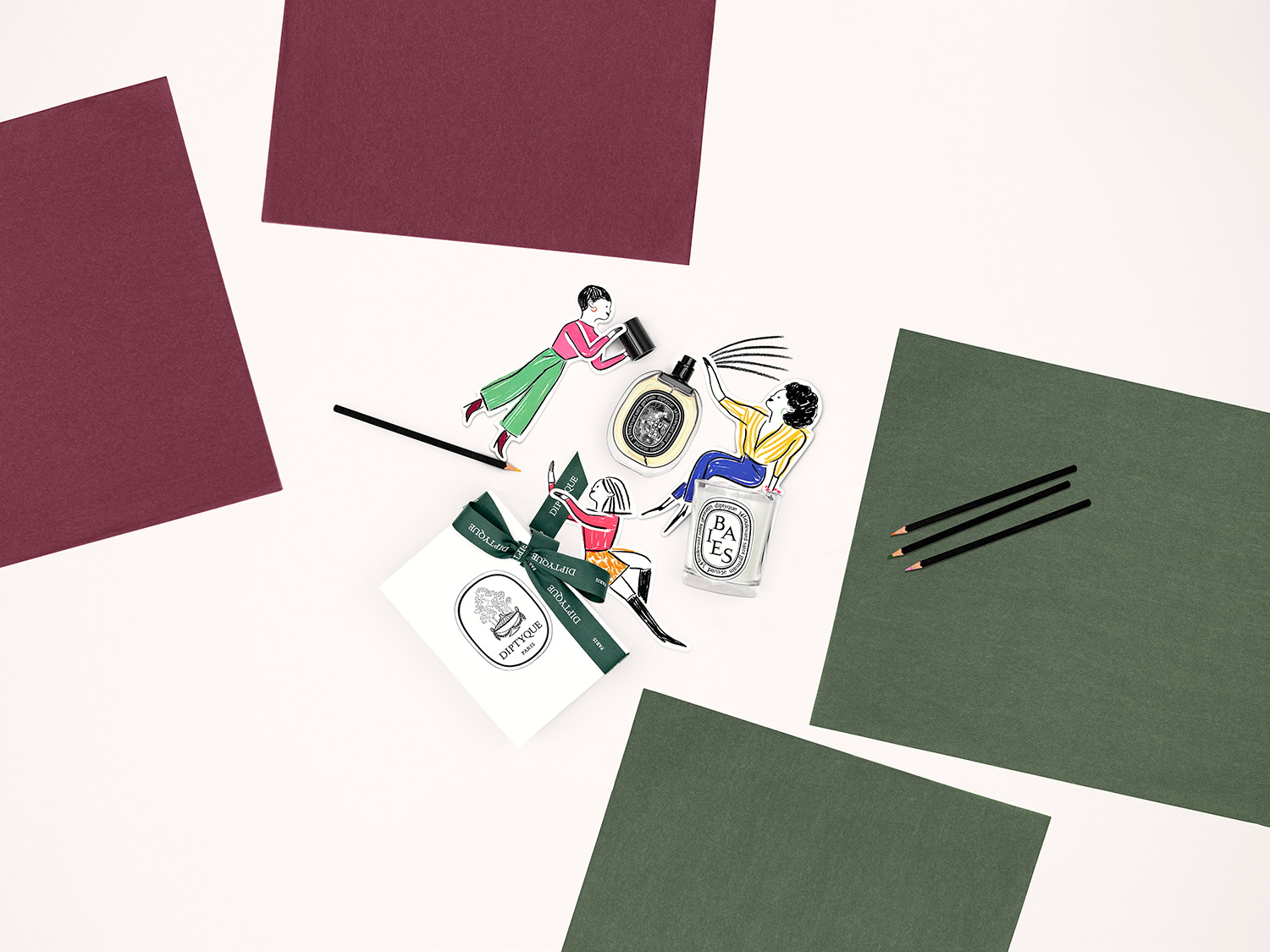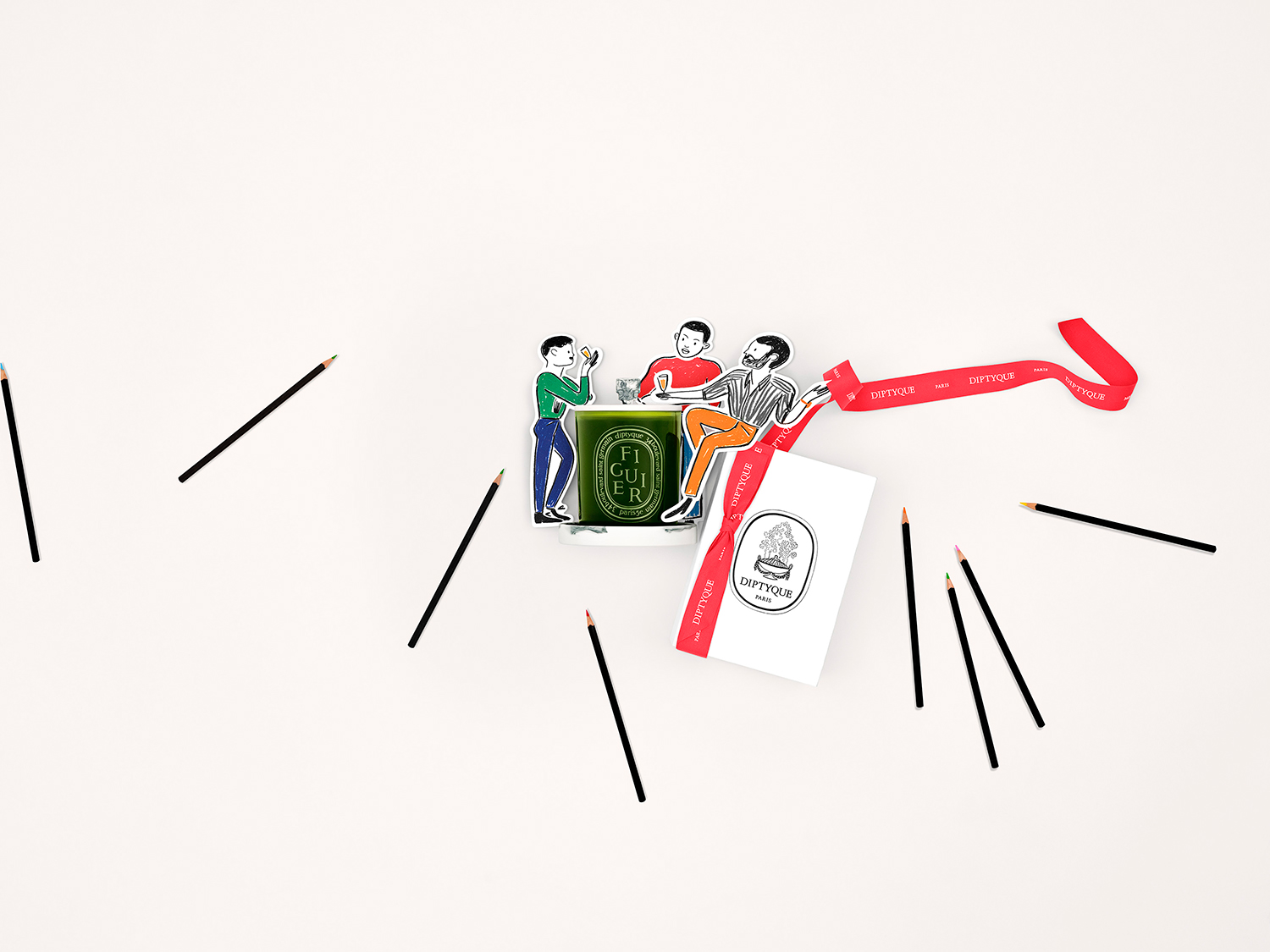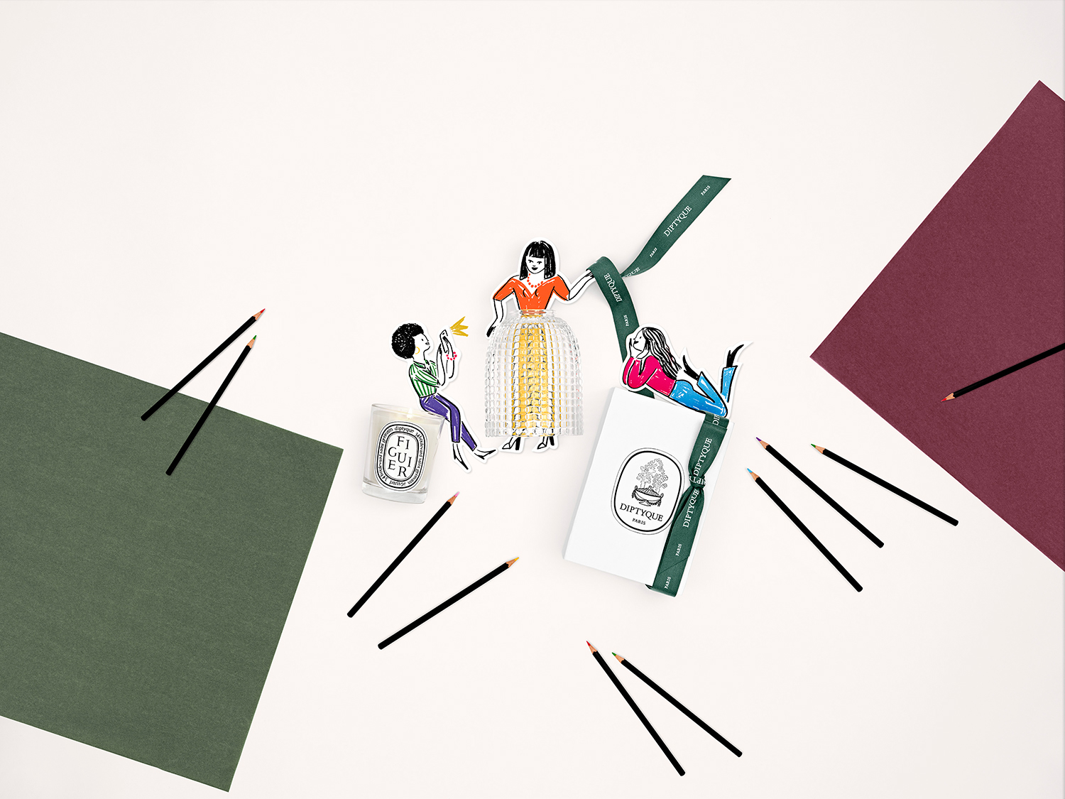 Set design and photo shoot for Diptyque's digital communications for Mother's Day and Father's Day, based on illustrations by Édith Carron.