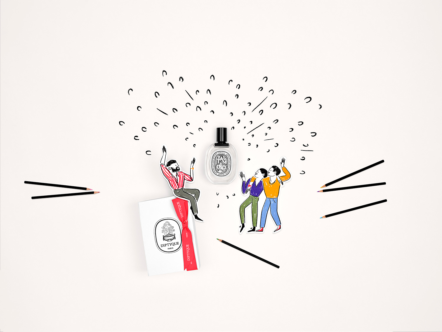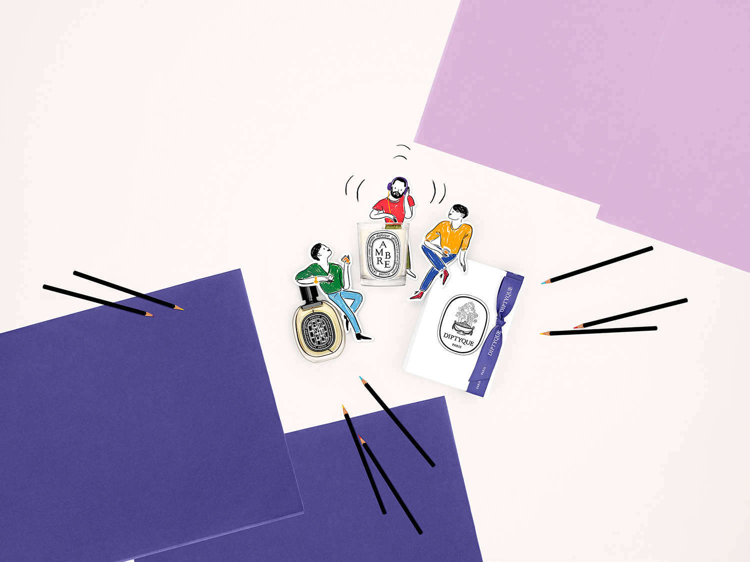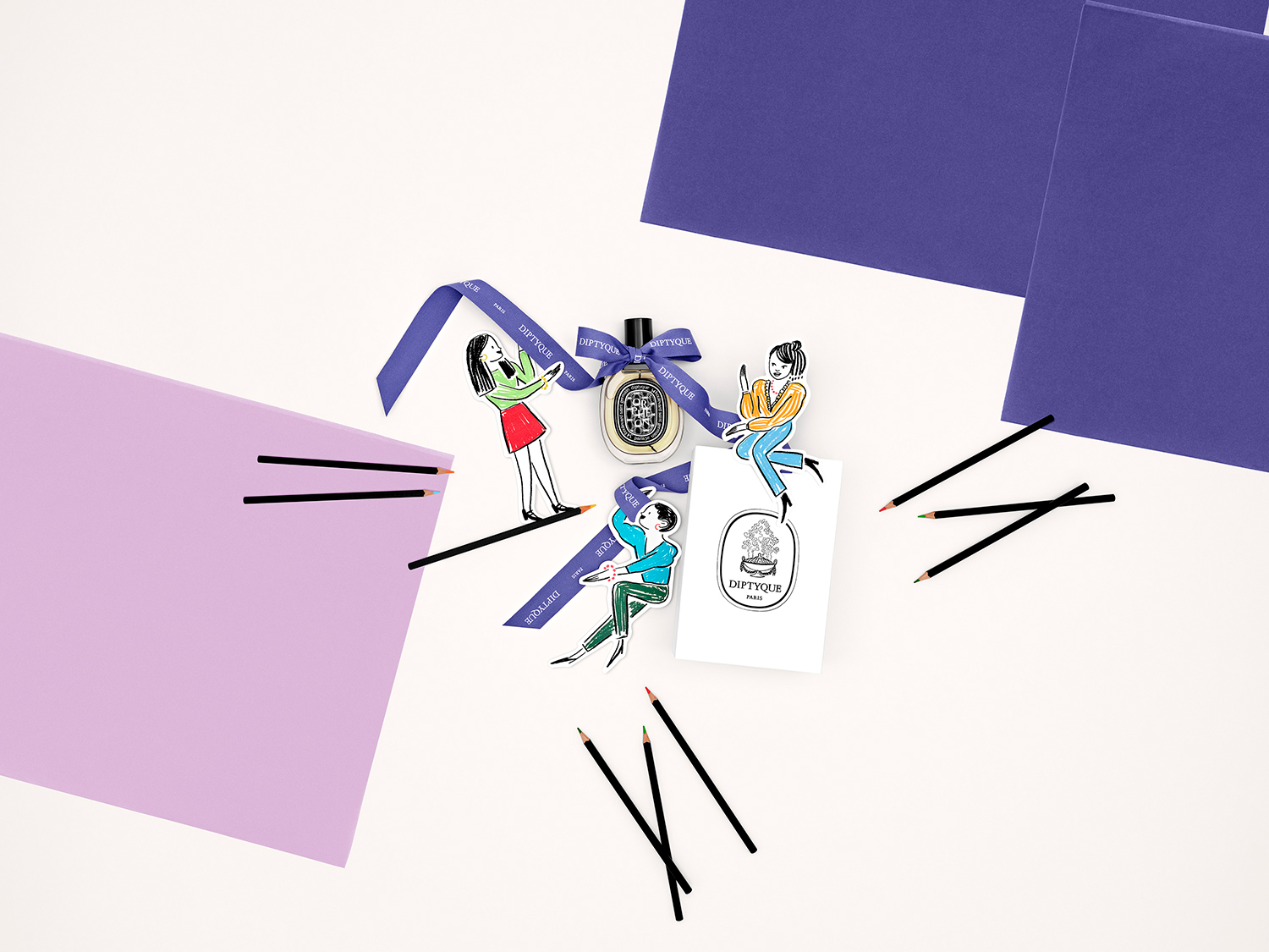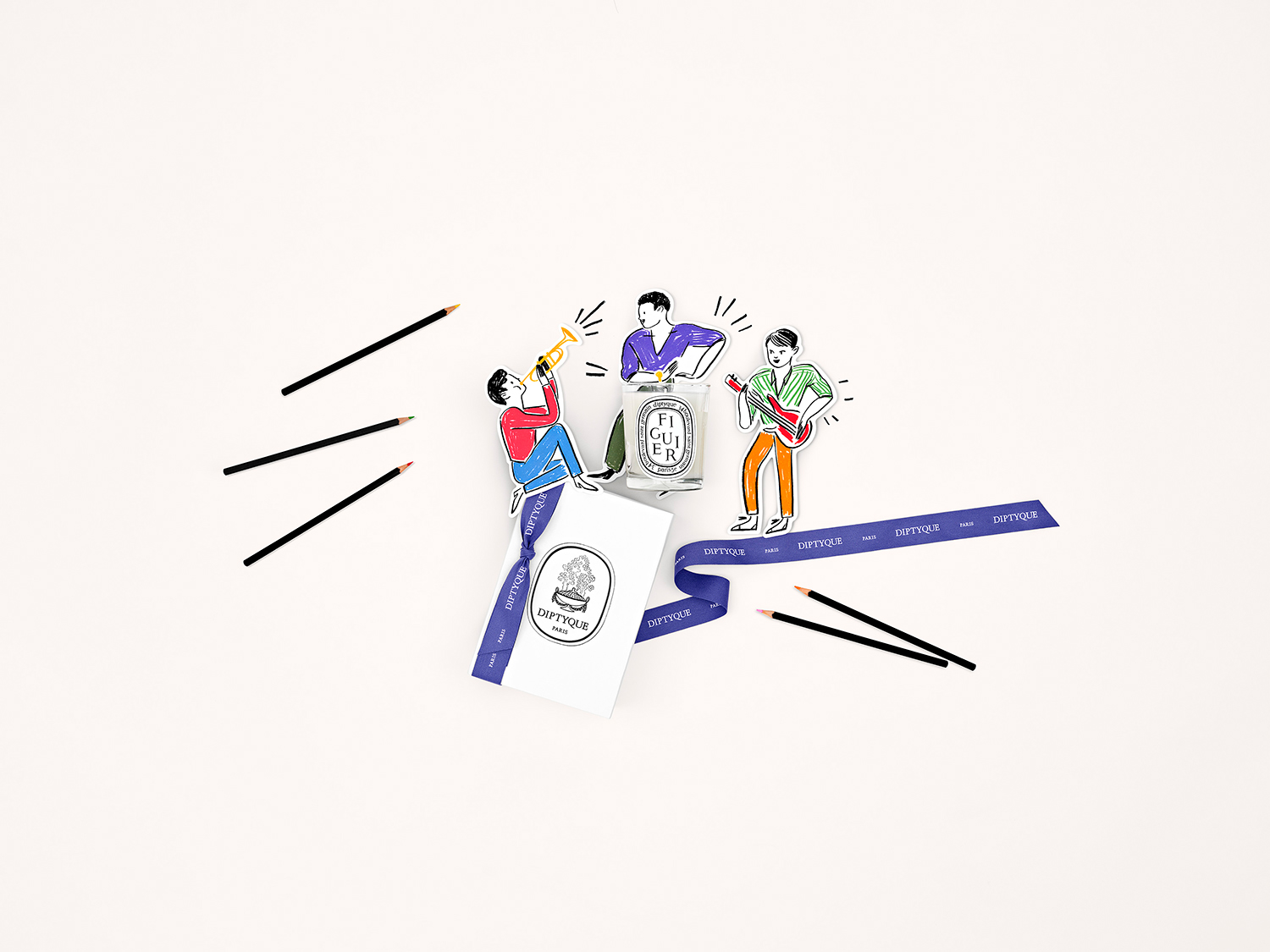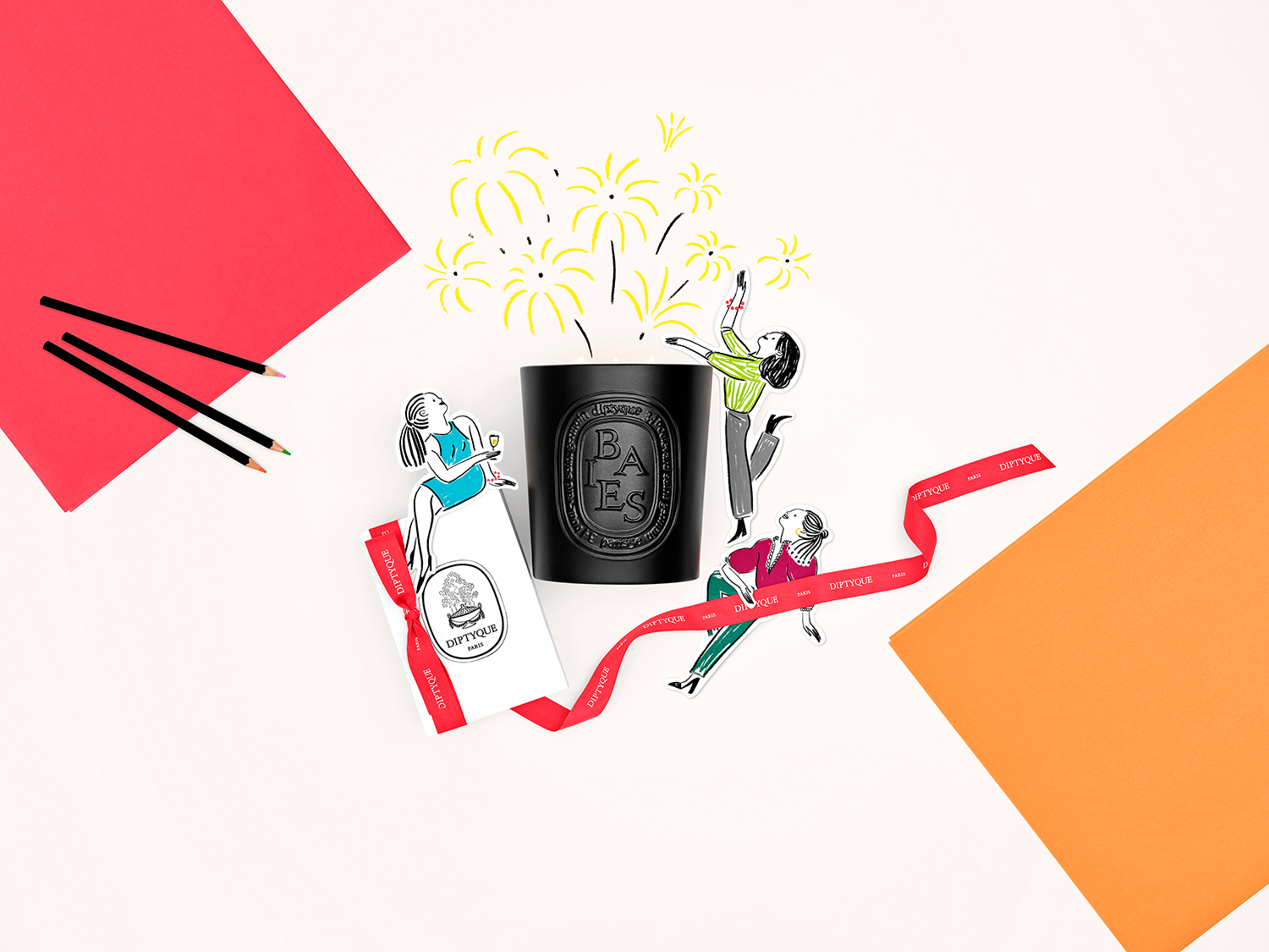 Set design and photo shoot for Diptyque's digital communications for Mother's Day and Father's Day, based on illustrations by Édith Carron.