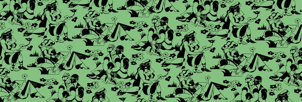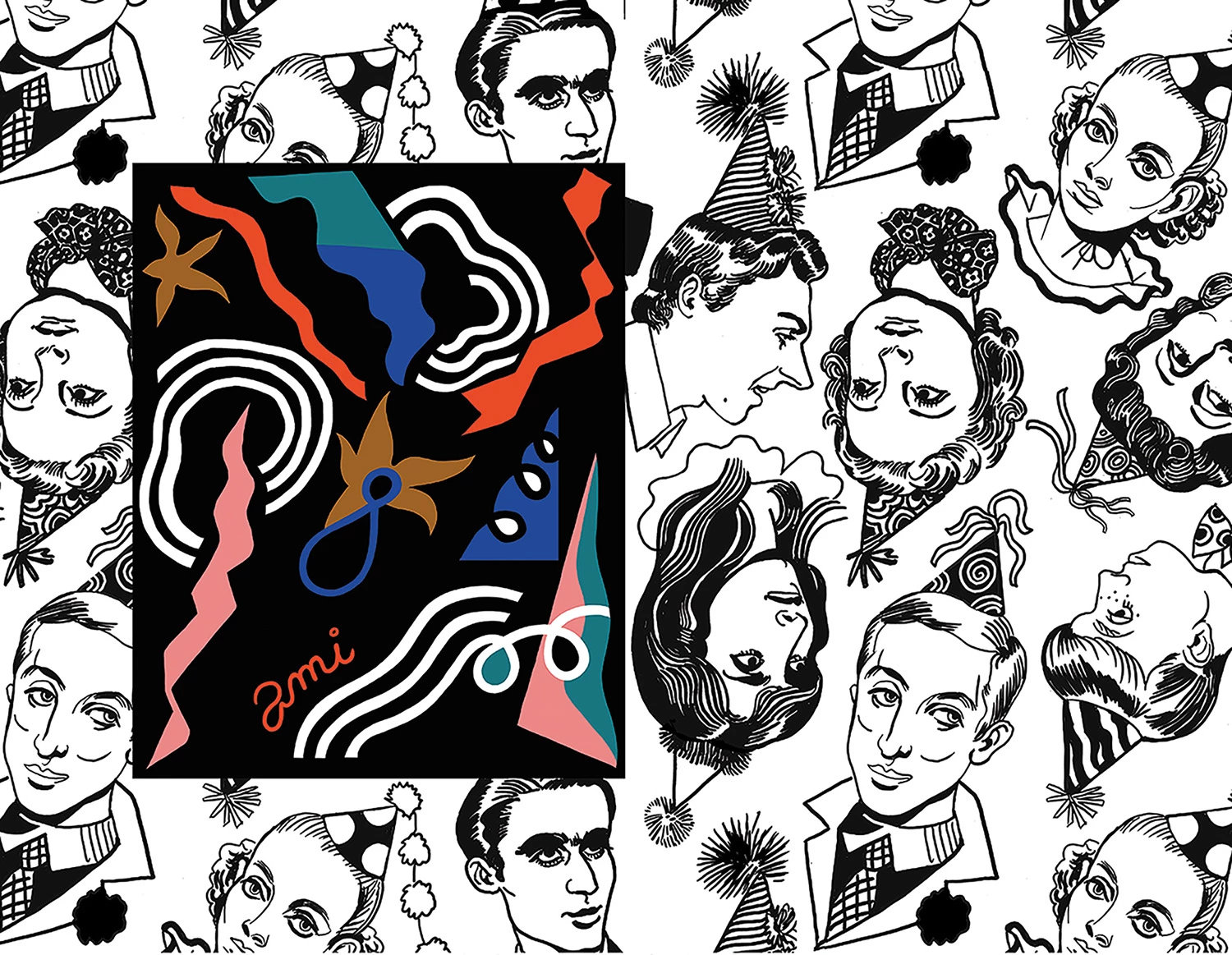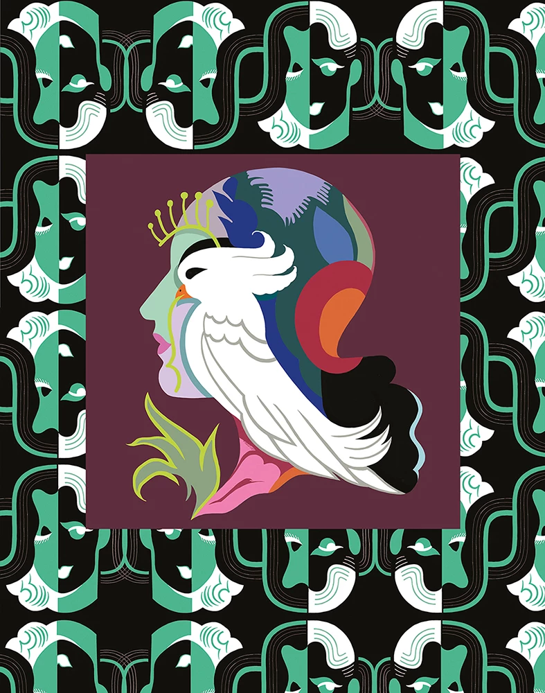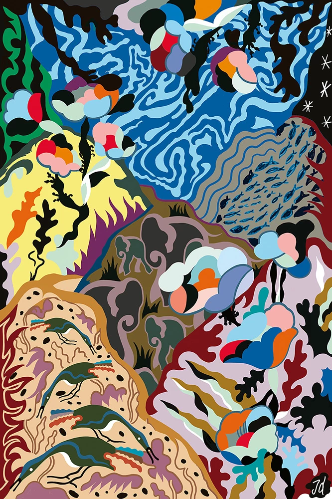 Jeanne Detallante brilliantly blends retro influences and modernity, creating an instantly recognizable style. Her work, both chic and eccentric, navigates between fantasy and whimsy. Her original patterns, vibrant colors, and timeless surrealist figures compose unique worlds that particularly appeal to the fashion and luxury spheres. Her collaborations with Prada and Louis Vuitton are particularly noteworthy.