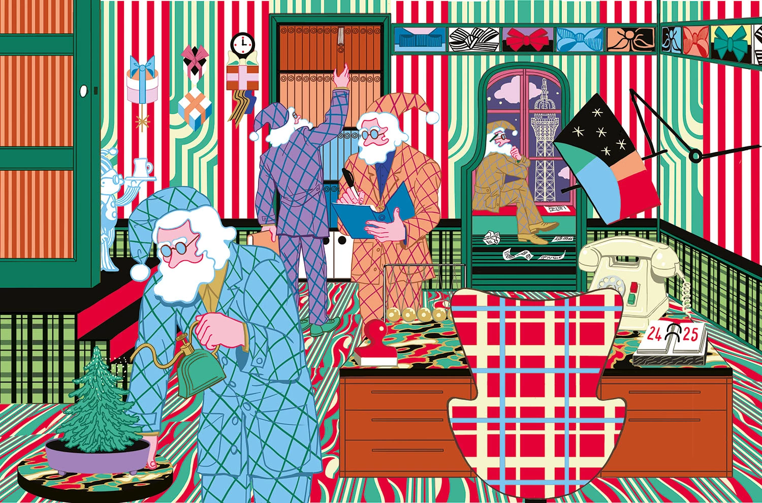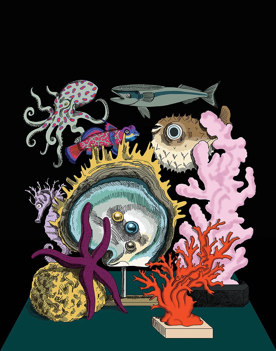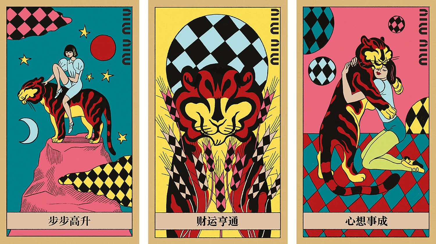 Jeanne Detallante brilliantly blends retro influences and modernity, creating an instantly recognizable style. Her work, both chic and eccentric, navigates between fantasy and whimsy. Her original patterns, vibrant colors, and timeless surrealist figures compose unique worlds that particularly appeal to the fashion and luxury spheres. Her collaborations with Prada and Louis Vuitton are particularly noteworthy.