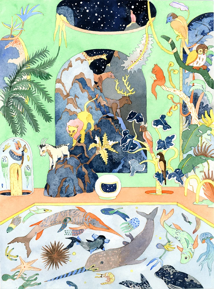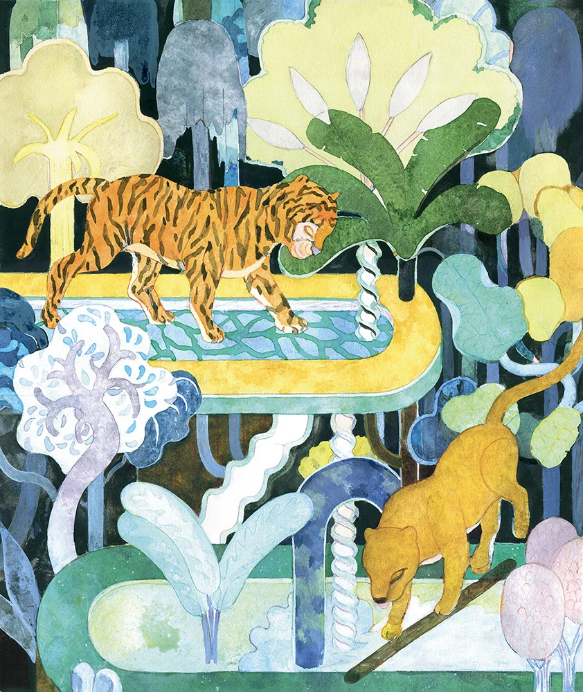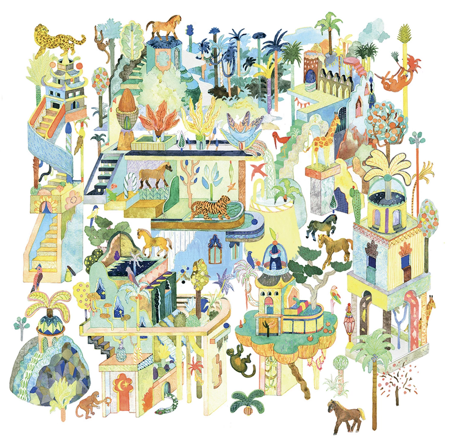 Laura Ancona crée des univers visuels vibrants où formes, couleurs et motifs se métamorphosent. Elle mêle nature, abstraction et éléments populaires dans un style carnavalesque et organique. Elle fait jouer dans son travail, les échelles, les transparences et les contrastes : animal et végétal, naturel et artificiel, abstraction et figuration.
