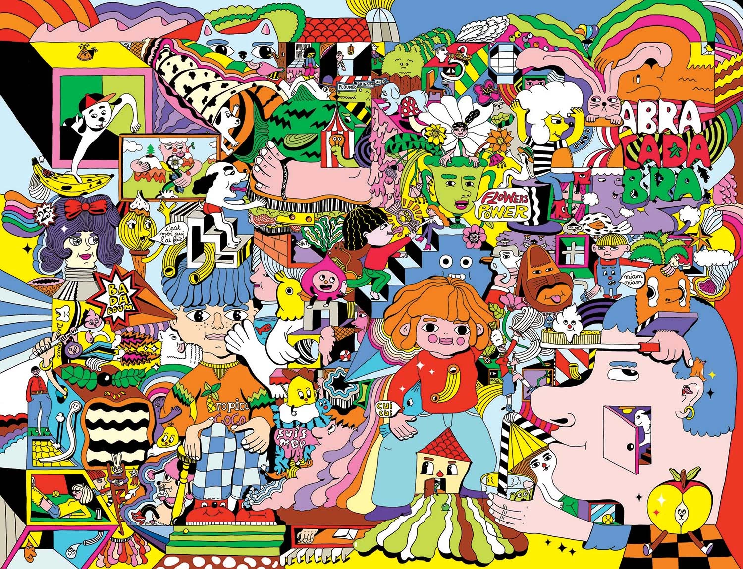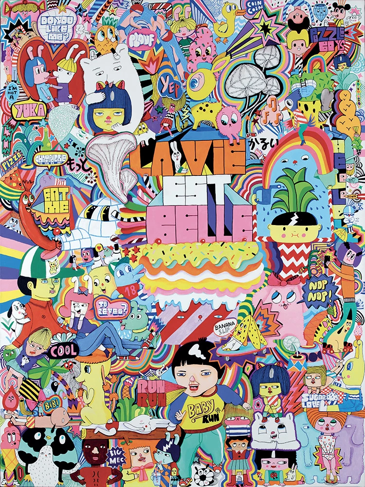 Son style naïf et pop, à la fois coloré et foisonnant, aborde avec légèreté des thématiques plus adultes.